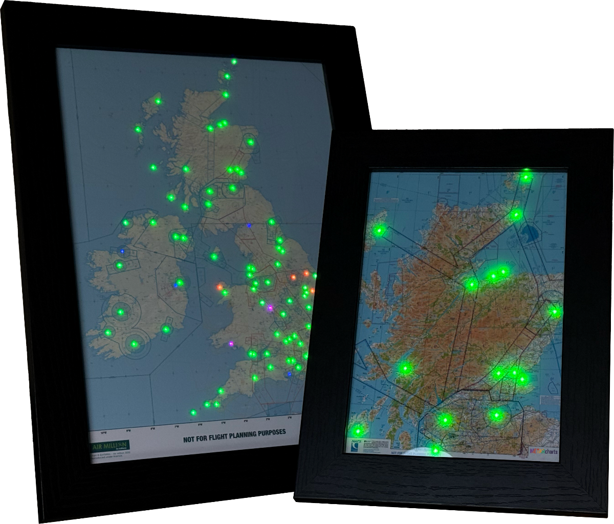 The chart is illuminated by individual LEDs at each airport that change colour to reflect the weather at each airfield in near real-time much like the map on popular EFB applications. See the weather locally, and further afield, at a glance.